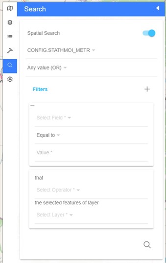 The last function of the main menu is the search option. The user chooses the thematic level of interest and the characteristic of the subject level at which he wants to perform the search. They can also use a filter by selecting the corresponding operator (is greater than, equal to, contains, etc.) to specify their search and click on the magnifying glass icon (Figure 18).
